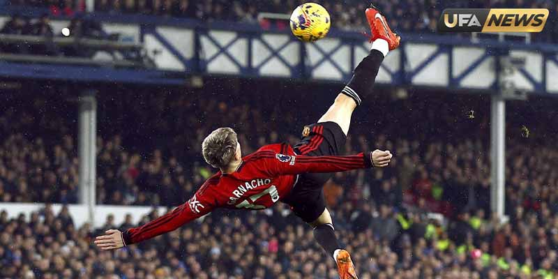 ประตูสุดสวยของการ์นาโช่ที่ถูกยกให้เป็นประตูยอดเยี่ยม เกิดขึ้นในนาทีที่ 3 ของเกมที่แมนยูไนเต็ดเปิดบ้านถล่มเอฟเวอร์ตัน 3-0 เมื่อแนวรุกวัย 24 ปี วิ่งรับบอลก่อนจะสอดตัวพุ่งแรงระหว่างสองกองหลังของเจ้าบุญทุ่ม แล้วซัดจังหวะลอยตัวด้วยลูกจักรยานหนึบสุดงดงาม