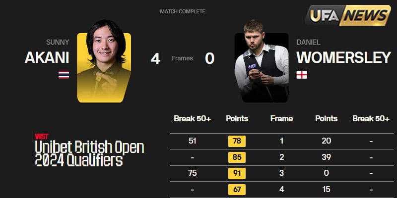 นักแทงสนุ๊กเกอร์ไทย ซันนี่ อรรคนิธิ์ โชว์ฟอร์มร้อนแรงต่อเนื่อง คว้าชัยชนะ ในรอบคัดเลือก บริติช โอเพ่น ด้วยการเอาชนะ แดเนียล โวเมอร์สลี่ย์ แบบขาดลอย 4-0 เฟรม พร้อมทำเบรกสูงถึง 75 แต้ม