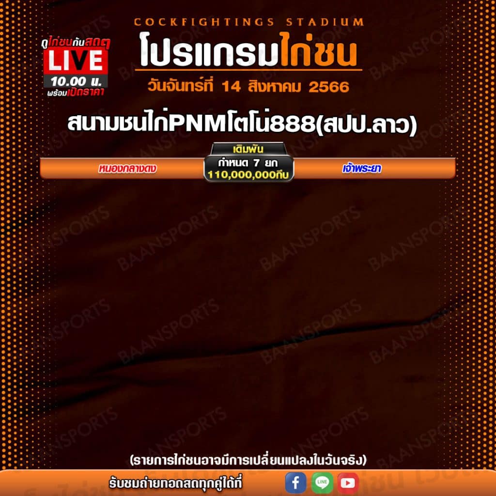 โปรแกรมไก่ชน วันจันทร์ที่ 14 สิงหาคม 2566